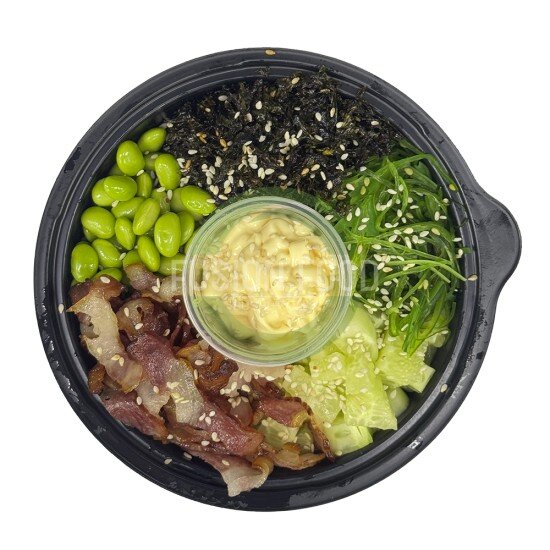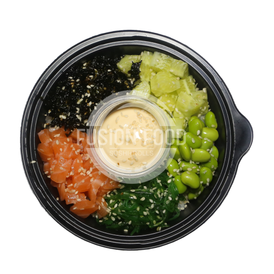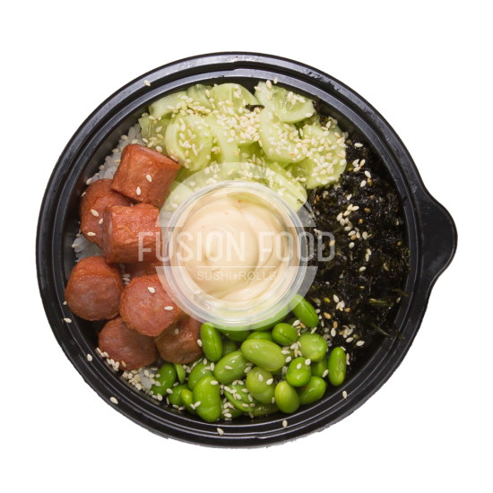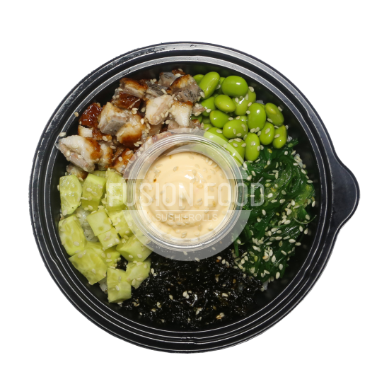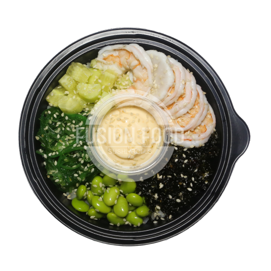 Рис, хлопья дольгим, бобы эдамаме, огурец, темпура креветки, кунжут, поке соус