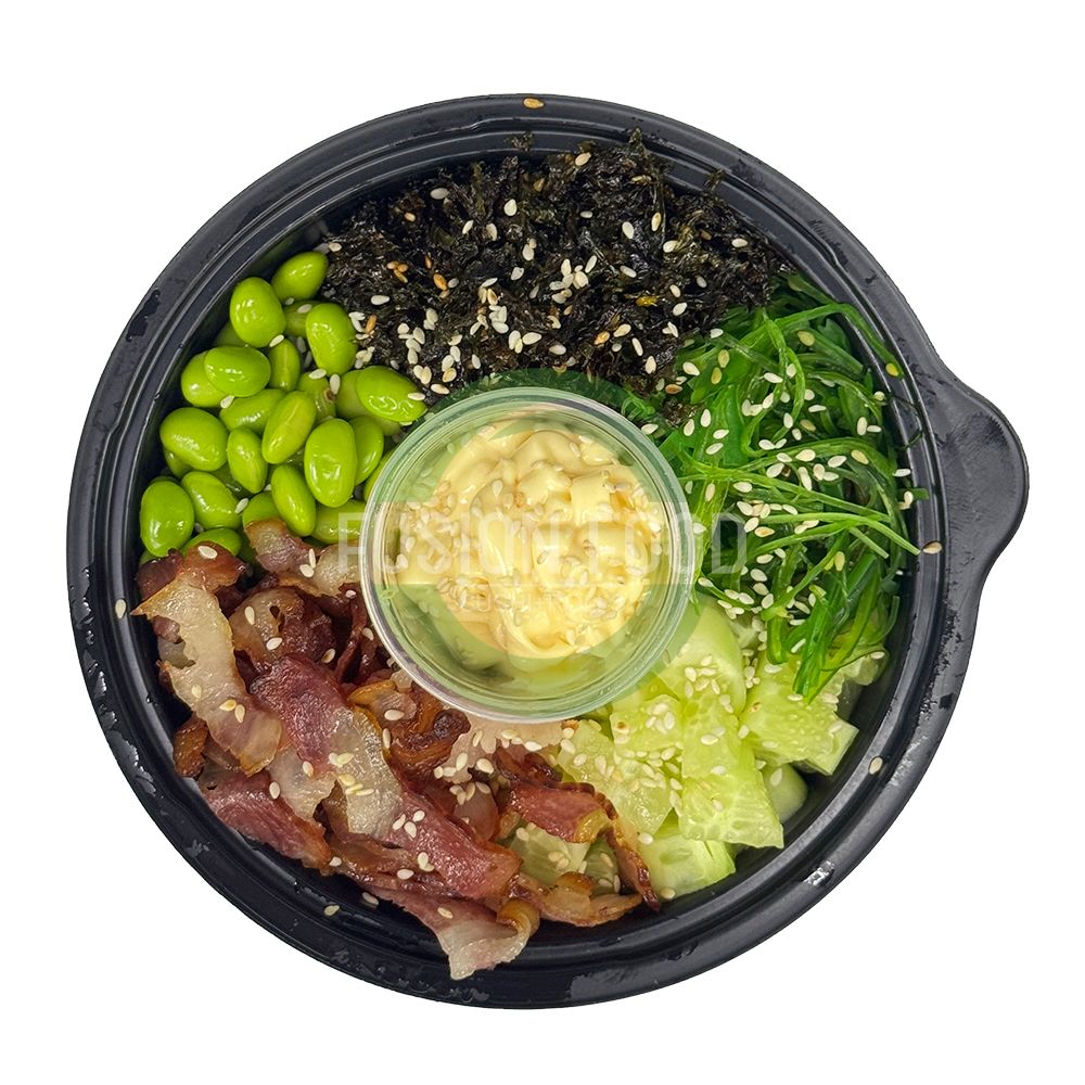 Рис, хлопья дольгим, бобы эдамаме, огурец, чукка, бекон, кунжут, поке соус