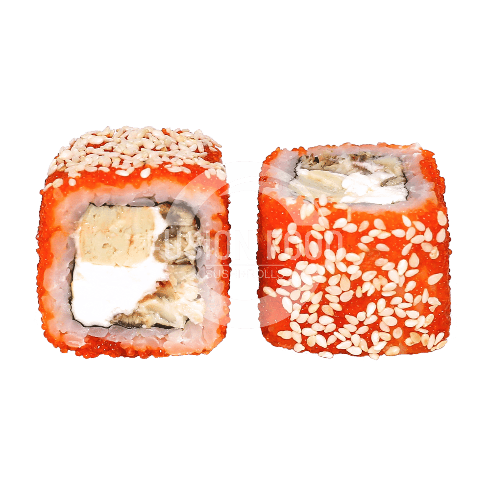 Рис, нори, сыр творожный, угорь, томаго, икра масаго, кунжут (Соевый соус 40г, Имбирь20, Васаби 10г)