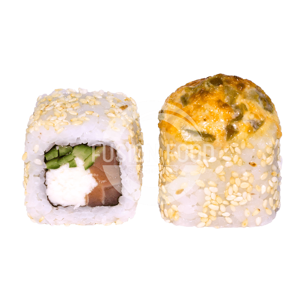 Рис, Нори, Моцарелла, Лосось Охлажденный, Огурец, Кунжут, Халапеньо, Соус Гриль, Соус Унаги (Соевый соус 40г, Имбирь20, Васаби 10г)