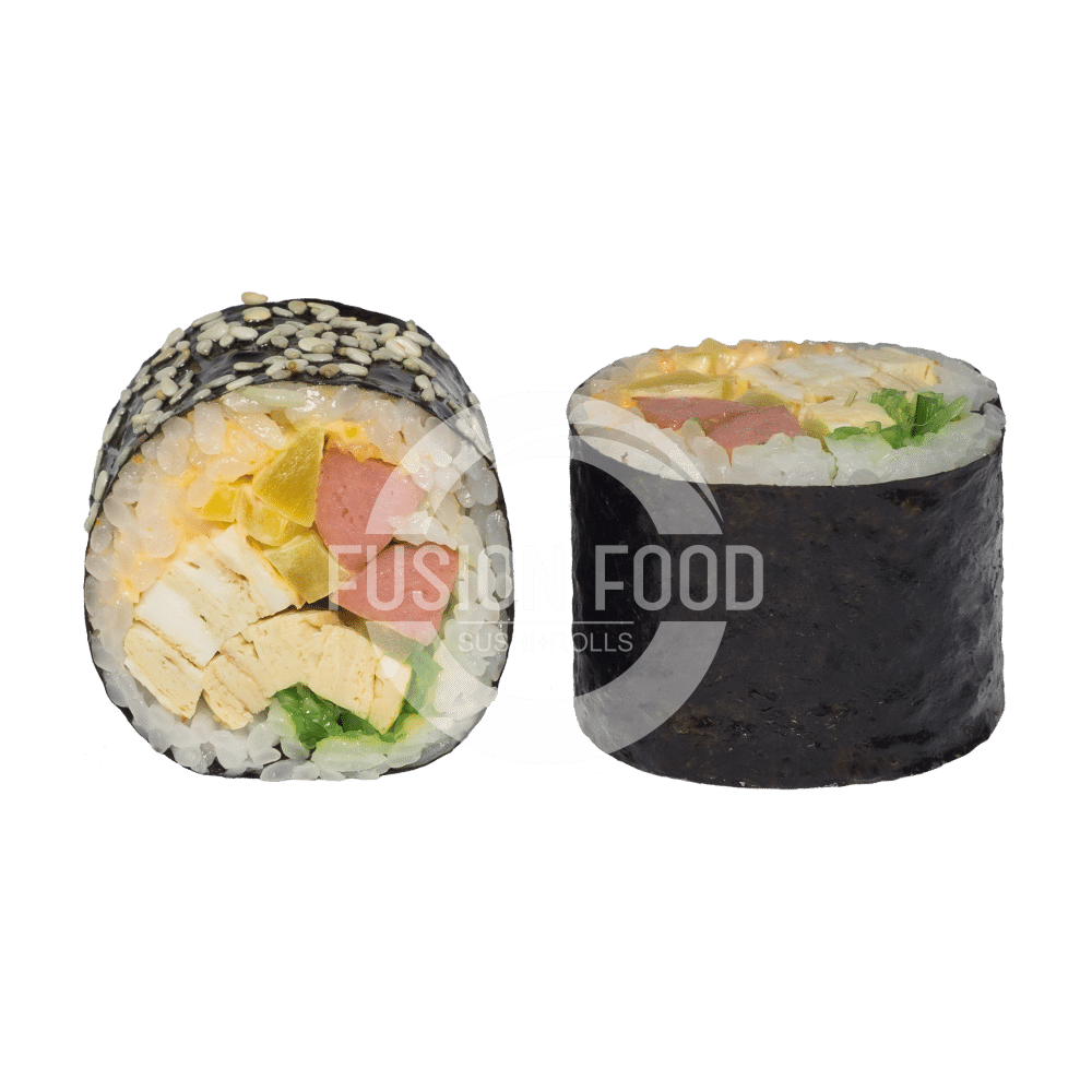 Рис, Нори, Сосиски Sibylla, Томаго, Соус Спайси, Такуан, Чукка, Масло Кунжутное, Кунжут