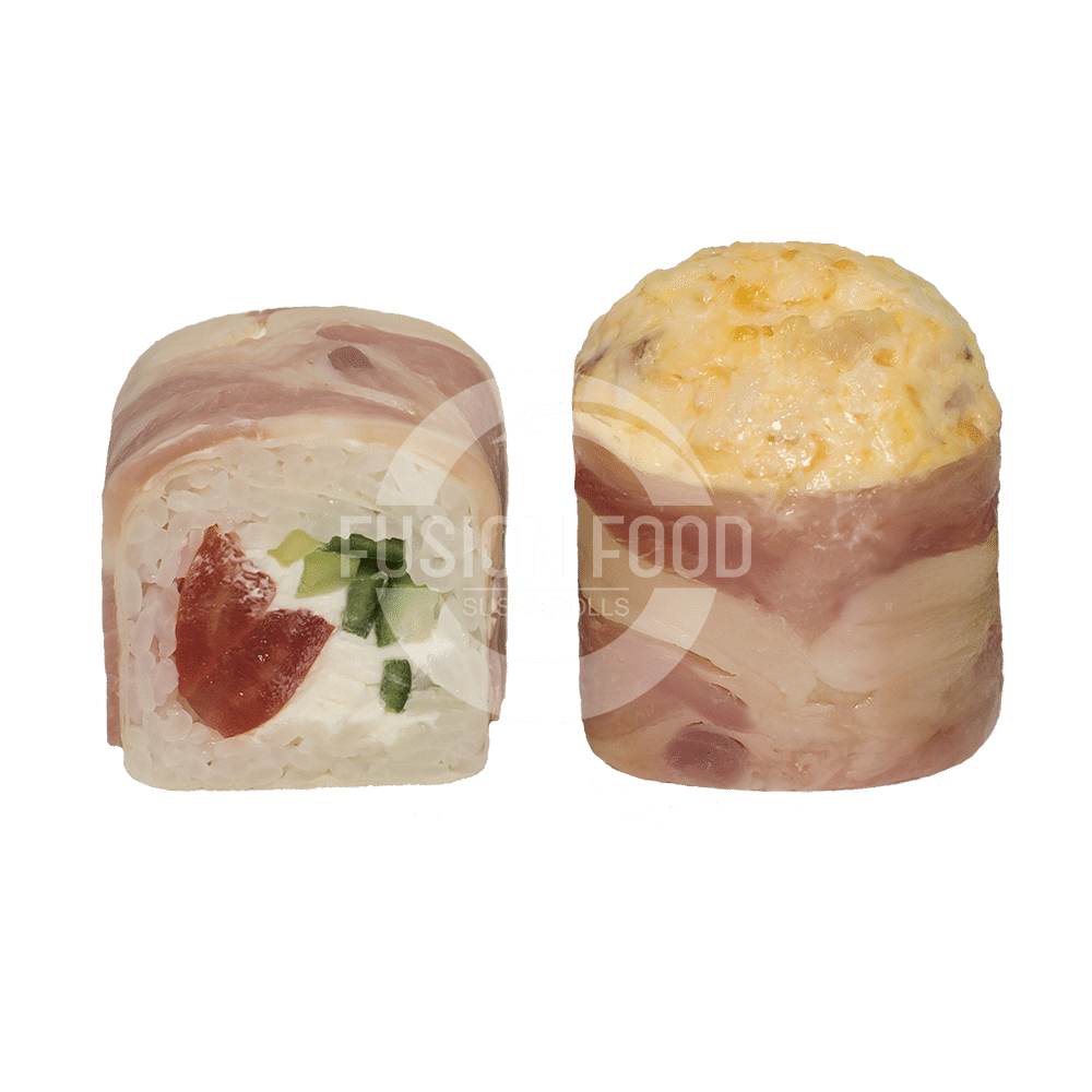 Рис, Японское Тесто, Курица***, Сыр Сливочный, Помидор, Огурец, Бекон, Соус Том-Ям, Гриль Соус.